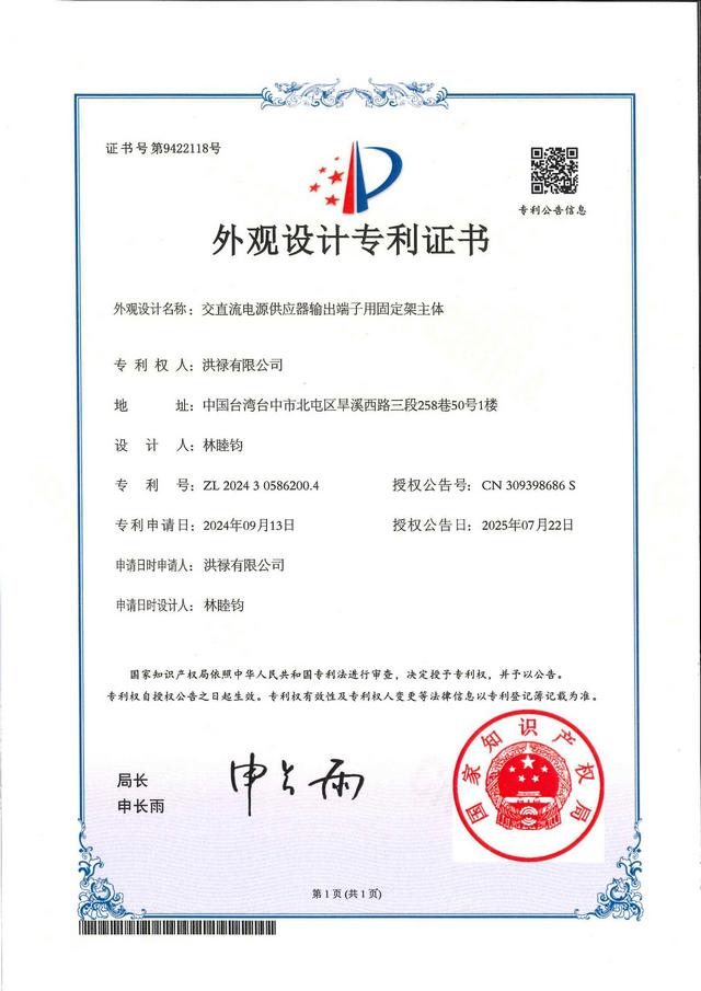 中國專利證書號碼 : ZL 2024 3 0586200.4