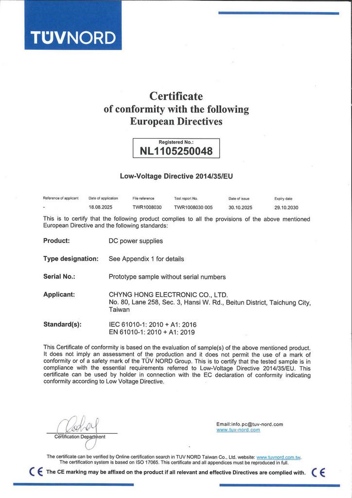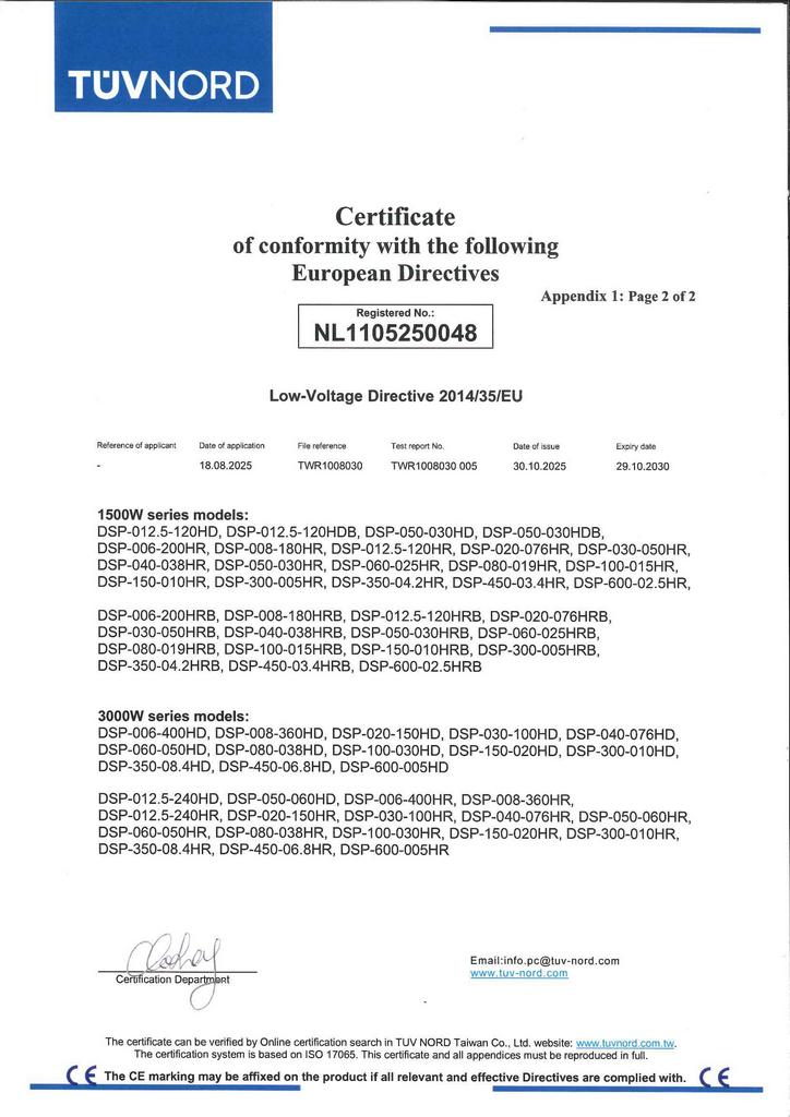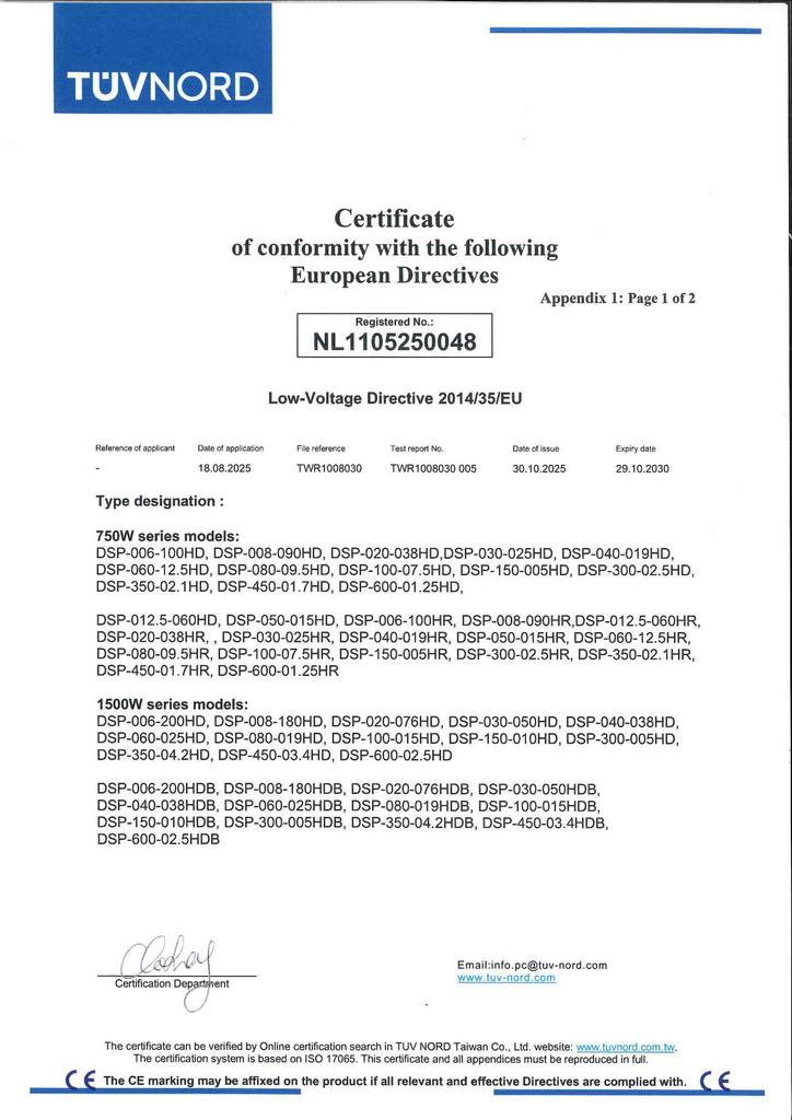 DSP-HD / DSP-HR series programmable dc power supply Certificate